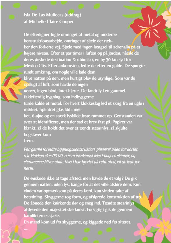 Vi er stolte af, at kunne fejre Michelle fra 2.O, der har vundet “DM i Novelle 2025” og dermed placeret sig blandt Danmarks mest talentfulde unge skribenter. Michelle deltager med sin gysernovelle “Isla De Las Muñecas”, og hendes præstation vidner om både skrivefærdigheder, kreativitet og en evne til at fordybe sig i en litterær proces. Her fortæller Michelle selv om sin oplevelse: